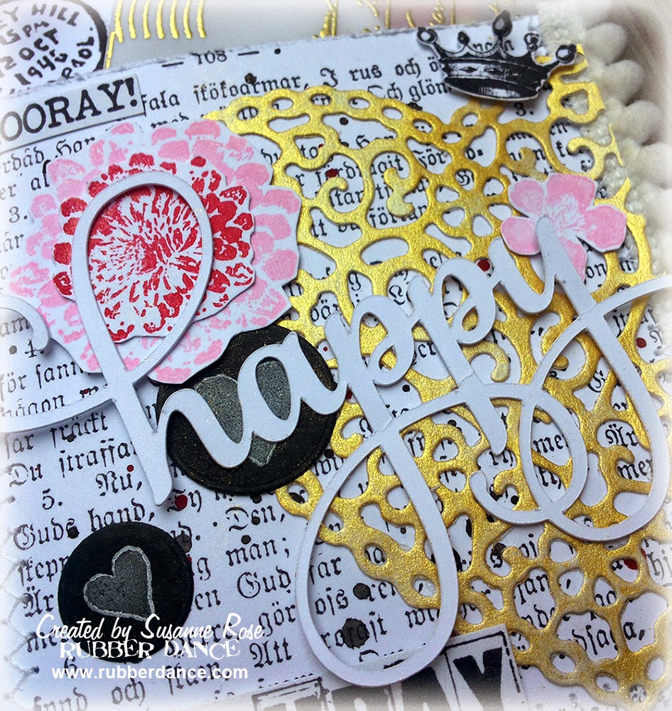 I used design paper from the Noor! Design "Let's party" Paper Pad and added some texture with black gesso from Dutch Doobadoo. I cut the letters with my Silhouette.