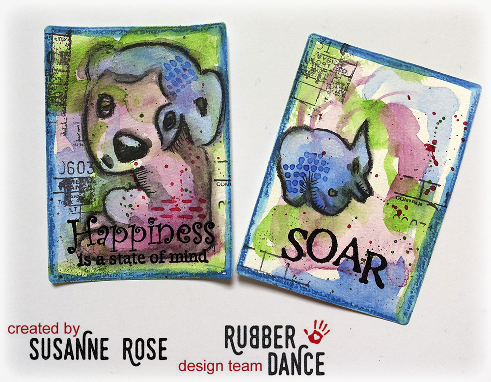 to spend in the Rubber Dance web shop!! You'll get a 15% discount in the Rubber Dance store when you use "susanne2016".Ich habe zwei Artist Trading Cards gestaltet. Dazu habe ich die Kuretake Aquarellfarben, Farbstifte, Aquarellkreiden und verschiedene Stempel von Rubber Dance verwendet.